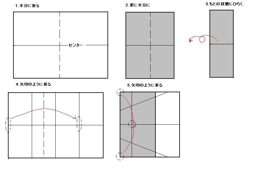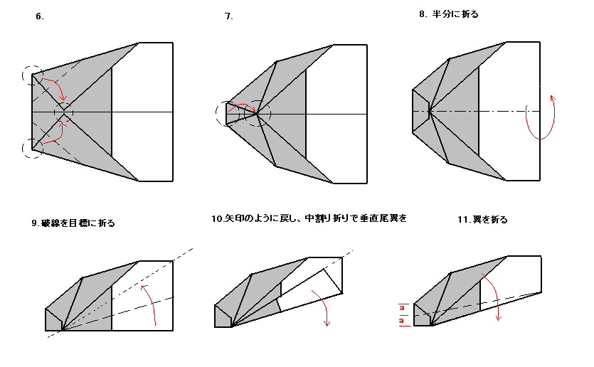 この型は紙ヒコーキの基本的な要素を忠実にとりこんだ機です。つまり、一つのポイントをめがけて集中的に折り重ねていき、翼の骨格を作り、前よりに重心をもたせる基本手法を用います。