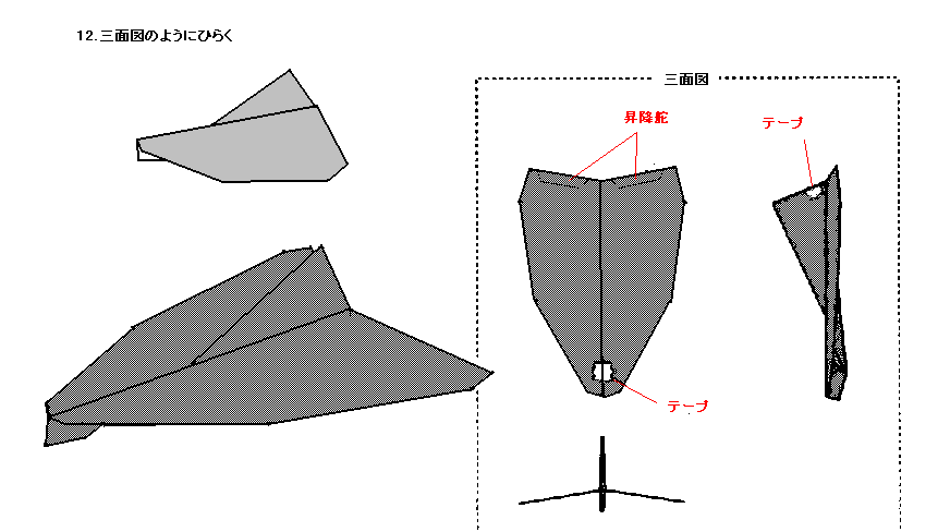 ていねいに折らないと、翼のよじれを起こしやすい機種です。かんたんそうに見えても意外に手こずるヒコーキといえます。
